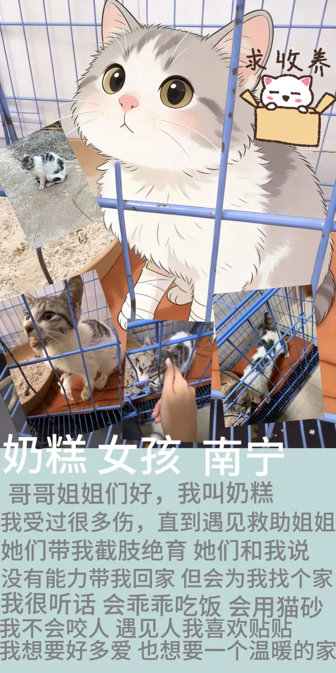 ■ 其他说明:奶糕是我们学校附近捡到的一只断腿的小猫咪,现在已经给它众筹顺利完成了截肢手术和绝育手术,后续治疗我们会继续跟进,再打完疫苗和驱虫之后,想找到一位负责任的领养人,奶糕性格很好,不会咬人抓人,很喜欢贴贴,会用猫砂,能吃能喝,想要有个家