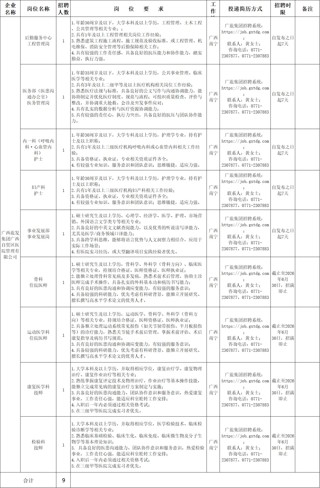 广西自贸区医院有关岗位员工9名
