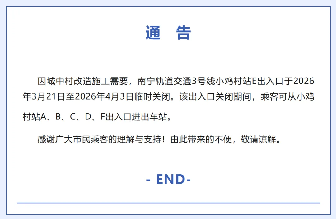 关于临时关闭南宁轨道交通3号线小鸡村站E出入口