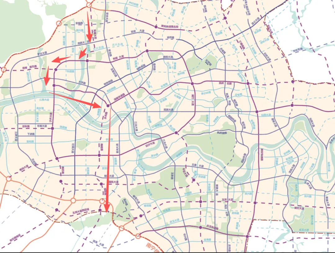 现在方案定明明白白!南起发展大道,绕丰达路接秀厢、清厢快速路,再从永和立交分线往南走,直接绕开了西大片区,还把现有快速路资源用透了。