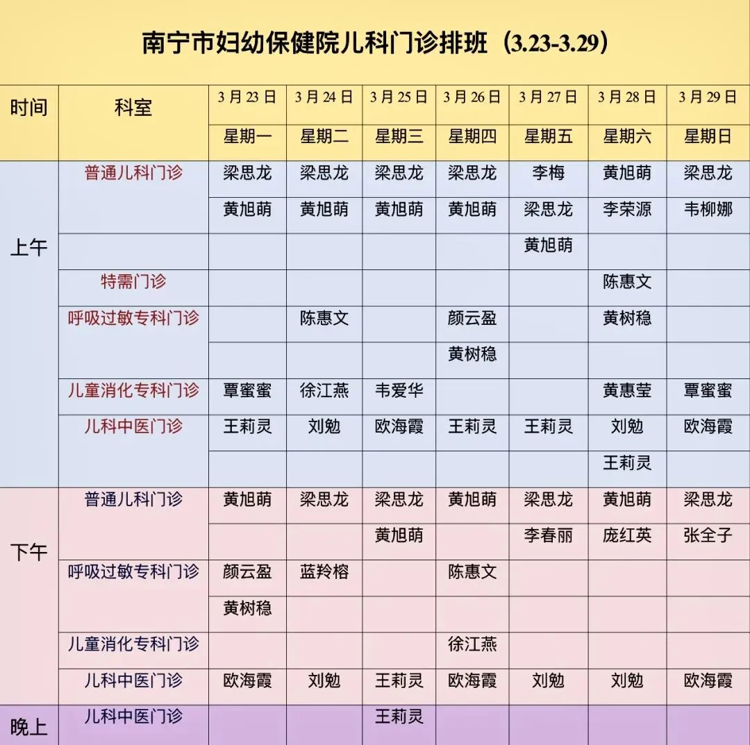 南宁市妇幼保健院儿科门诊医生排班表(3月23日~3月29日)