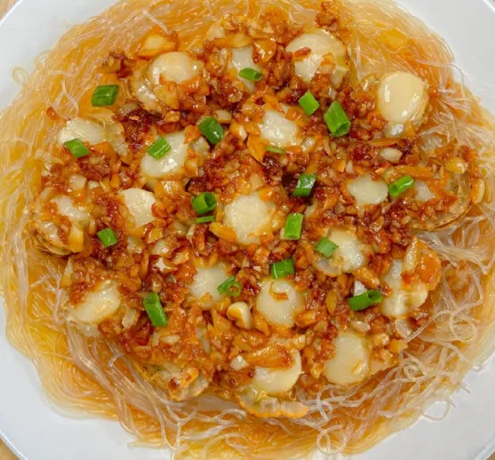 蒜蓉粉丝蒸扇贝:粉丝先用温水泡软,铺在扇贝壳上,扇贝肉放回去。蒜末用一点油小火煸香,别糊,淋在扇贝上,加少许生抽和一点点糖提鲜。大火蒸三五分钟,出锅撒葱花。热气一冒,海味就被蒜香牵出来了。