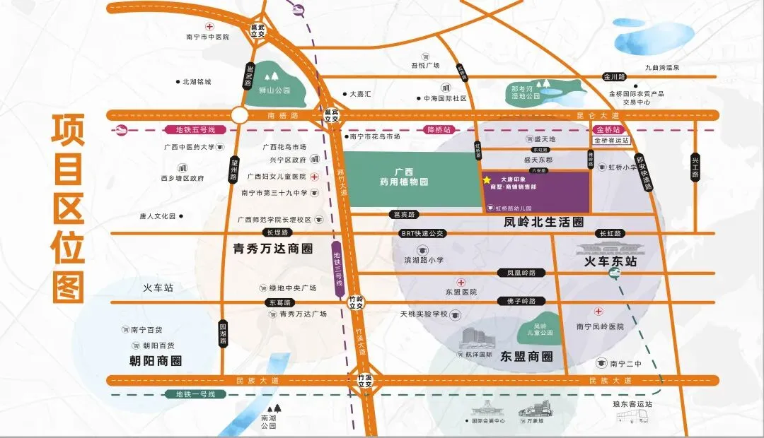项目周边配套成熟,商业有盛天地、吾悦广场,公园有广西药用植物园、那考河湿地公园,教育有家门口的公立虹桥路幼儿园、虹桥小学。