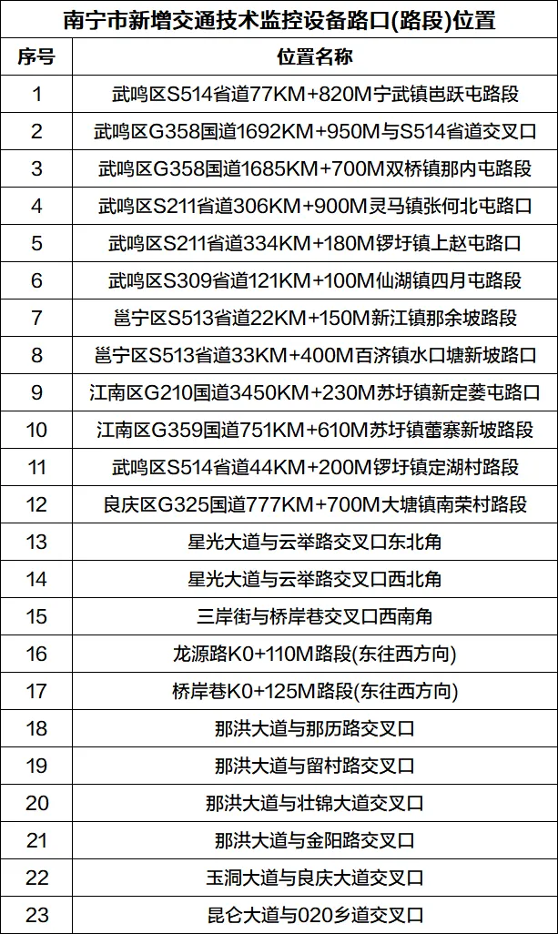 3月23日零时起,南宁交警部门在武鸣区S514省道77KM+820M岜跃屯路段、武鸣区G358国道1692KM+950M与S514省道交叉口等12个路口路段,启用电子警察设备,对驾驶机动车不按规定使用安全带、违反禁止标线指示、驾驶时拨打接听手持电话等交通违法行为依法抓拍取证并予以处罚。