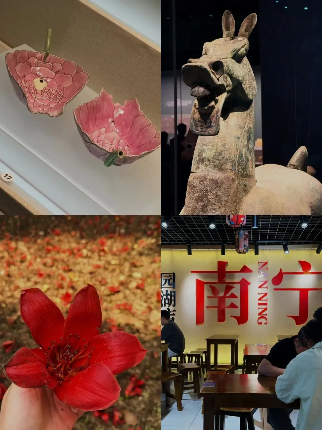 人民币上的五种民族文字分别是汗、蒙、藏,维、壮,壮族有自己的民族文字,这是个很了不起的事情。到南宁是晚上,所以先去逛了夜市,第二天早上起来第一件事就是去广西壮族自治区博物馆,博物馆面积很大,一层大致按时间顺序介绍了这块土地的历史,二层以上则主要是各种主题展,如瓷器展、民族文化展等等,其中我比较感兴趣的是地名展,一个地区名字的发展变迁,不仅映射了历史当中的重要节点,背后当然也有很多文化故事,看这个展大致能知道广西的很多地名其实来自壮语的方位用词,本质上和汉语还是非常接近的,汉语词汇多用东西南北等确指,广西因为地形复杂,则更多用地理特征+相对方位,比如这两年很有名的巴马县,“巴马”两字其实来自于壮语的发音,意思是:马形的山。