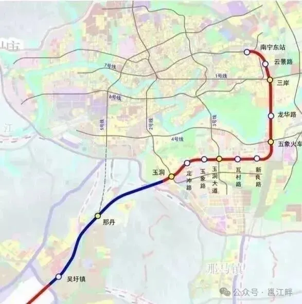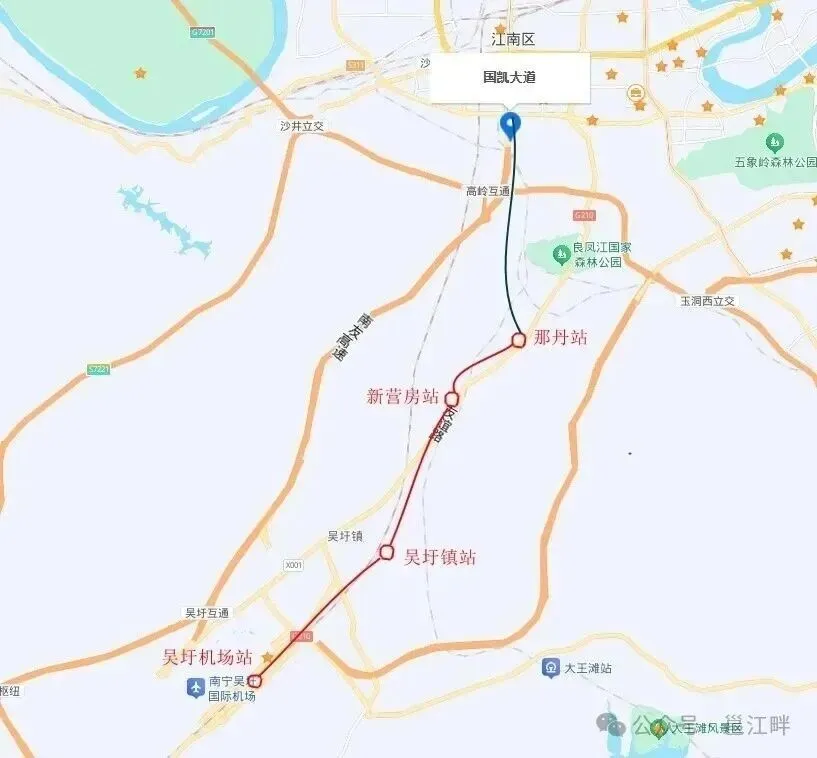 去年9月我们写了一篇《南宁地铁机场线S1何时开始建设?》,文中这条地铁线的具体走向政府给的信息是明确的,项目起点位于轨道交通5号线终点站(国凯大道),通过那丹站与轨道交通机场线一期工程连通,直达吴圩机场。也就是地铁5号线南延至那丹站,与机场线S1同步建设,形成一条去南宁吴圩机场的地铁线。这个规划是已于2022年8月获得国家发改委批复的南宁地铁第三轮规划中的两个线路。
