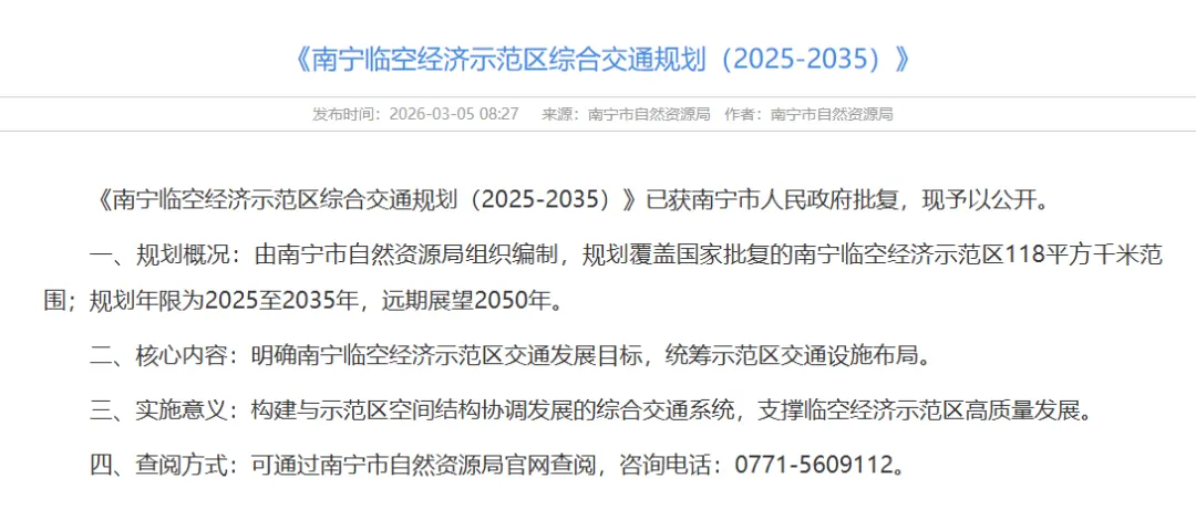 最近南宁市自然资源局专项规划中有一个《南宁临空经济示范区综合交通规划(2025-2035)》规划公示:
