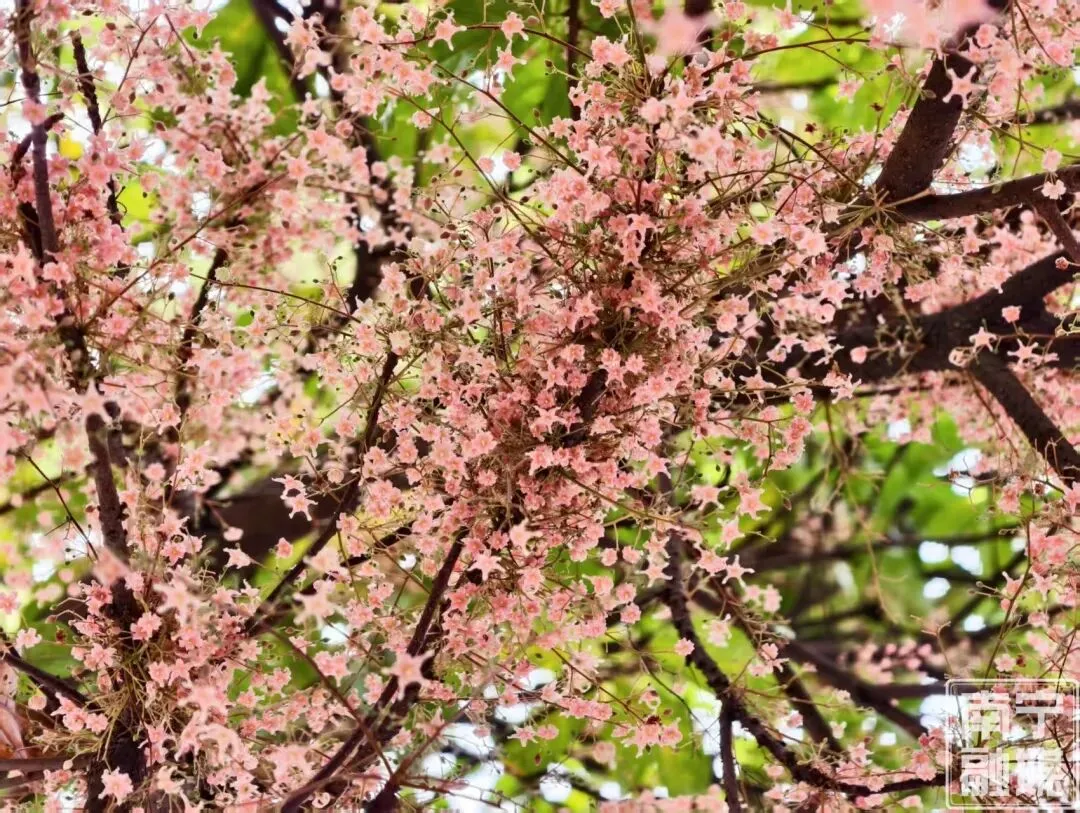 “快看!那棵树好像是在‘下雪’!”近日,路过民族大道国贸中心的市民莫女士突然拽住同伴的衣袖,指着人行道路边的几棵树惊呼道。同伴眯起眼睛,定睛一看,不远处一片奶白色的花雨正簌簌飘落,在三月的温暖阳光中闪着细碎的光。
