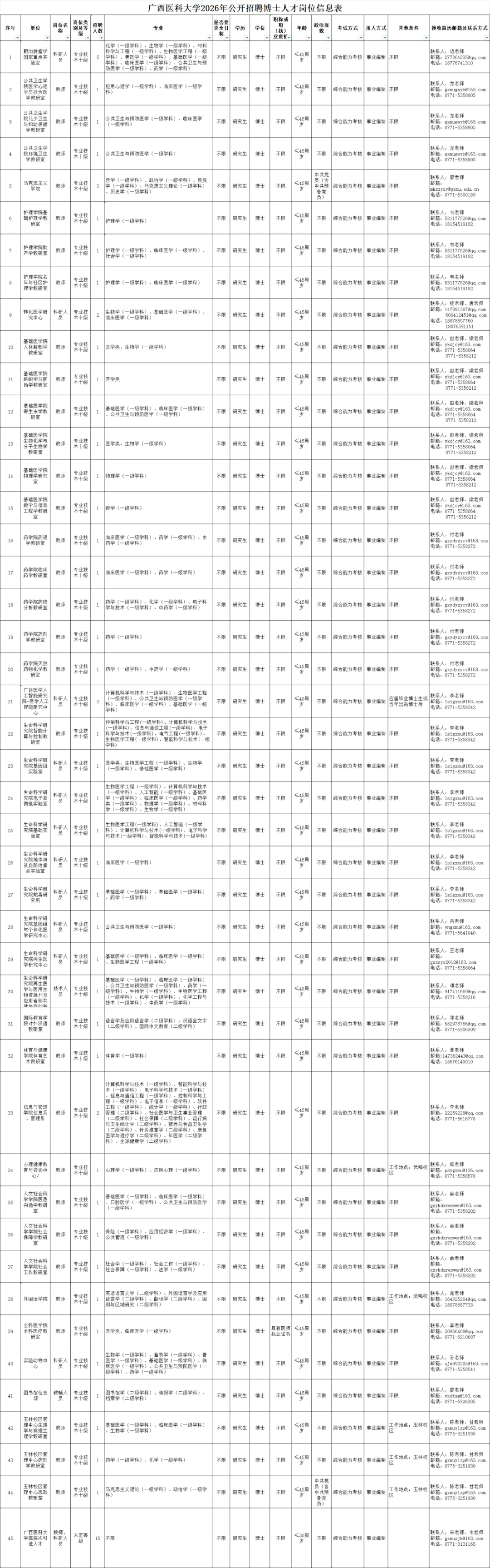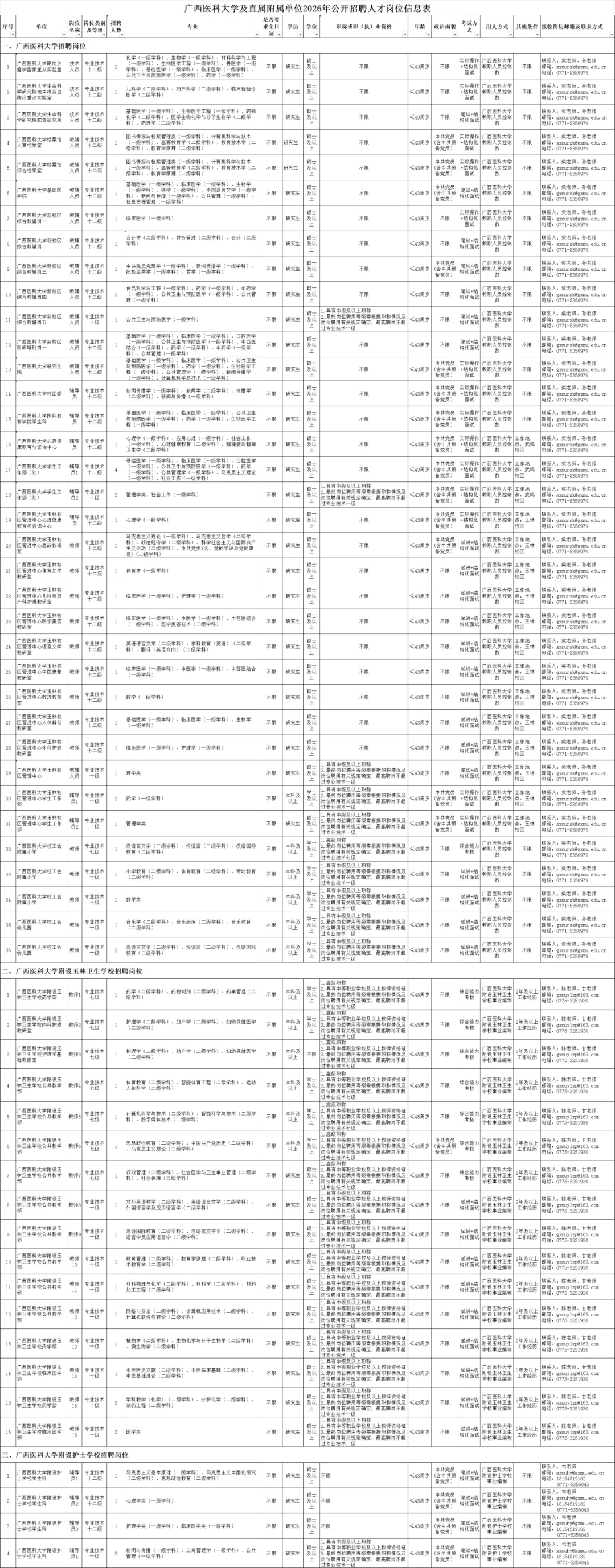 本次公开招聘的单位共有3家,其中广西医科大学教职人员控制数工作人员44名,广西医科大学附设玉林卫生学校实名编制工作人员20名,广西医科大学附设护士学校实名编制工作人员6名,具体岗位要求见《广西医科大学及直属附属单位2026年公开招聘人才岗位信息表》。