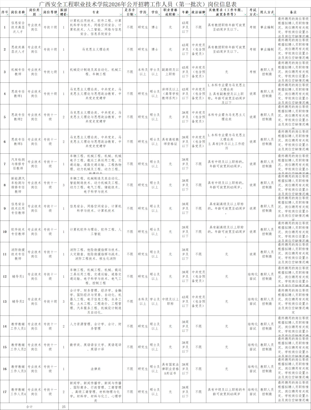 (五)具有符合岗位要求的文化程度、年龄、专业和工作能力。岗位条件详见《广西安全工程职业技术学院2026年公开招聘工作人员(第一批次)岗位信息表》,专业目录参考《广西壮族自治区考试录用公务员专业分类指导目录(2026年版)》。