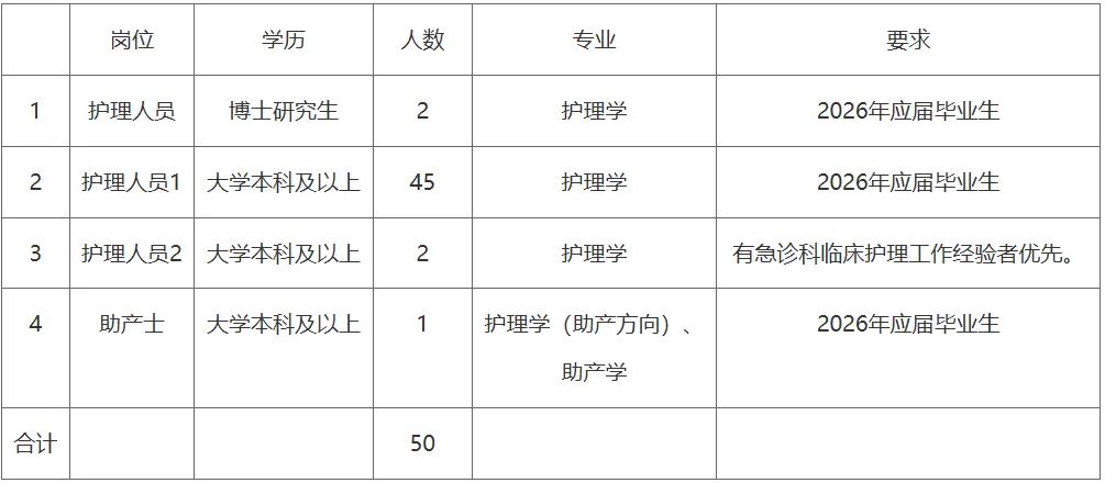 根据医院工作需要,现招聘护理人员50名。