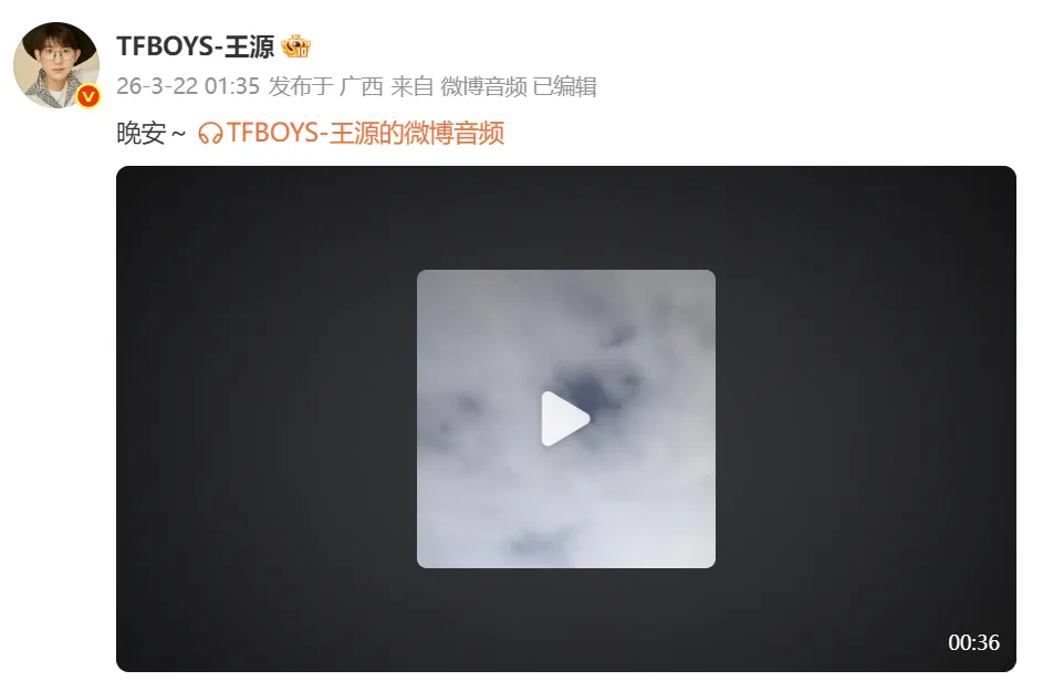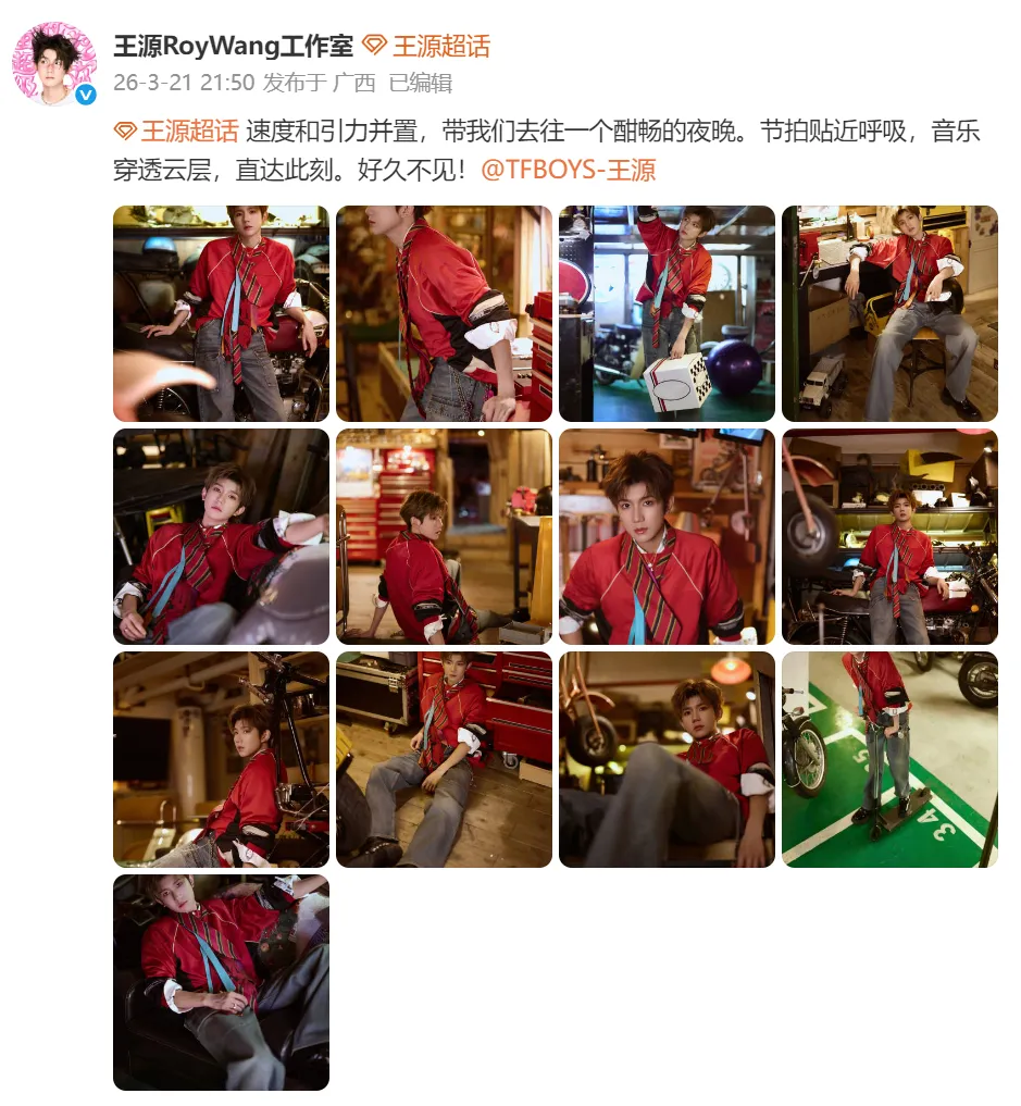 王源超话 速度和引力并置,带我们去往一个酣畅的夜晚。节拍贴近呼吸,音乐穿透云层,直达此刻。好久不见!@TFBOYS-王源