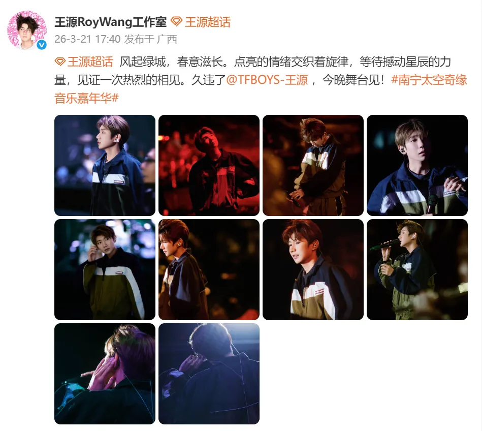 王源超话 风起绿城,春意滋长。点亮的情绪交织着旋律,等待撼动星辰的力量,见证一次热烈的相见。久违了@TFBOYS-王源 ,今晚舞台见!#南宁太空奇缘音乐嘉年华#