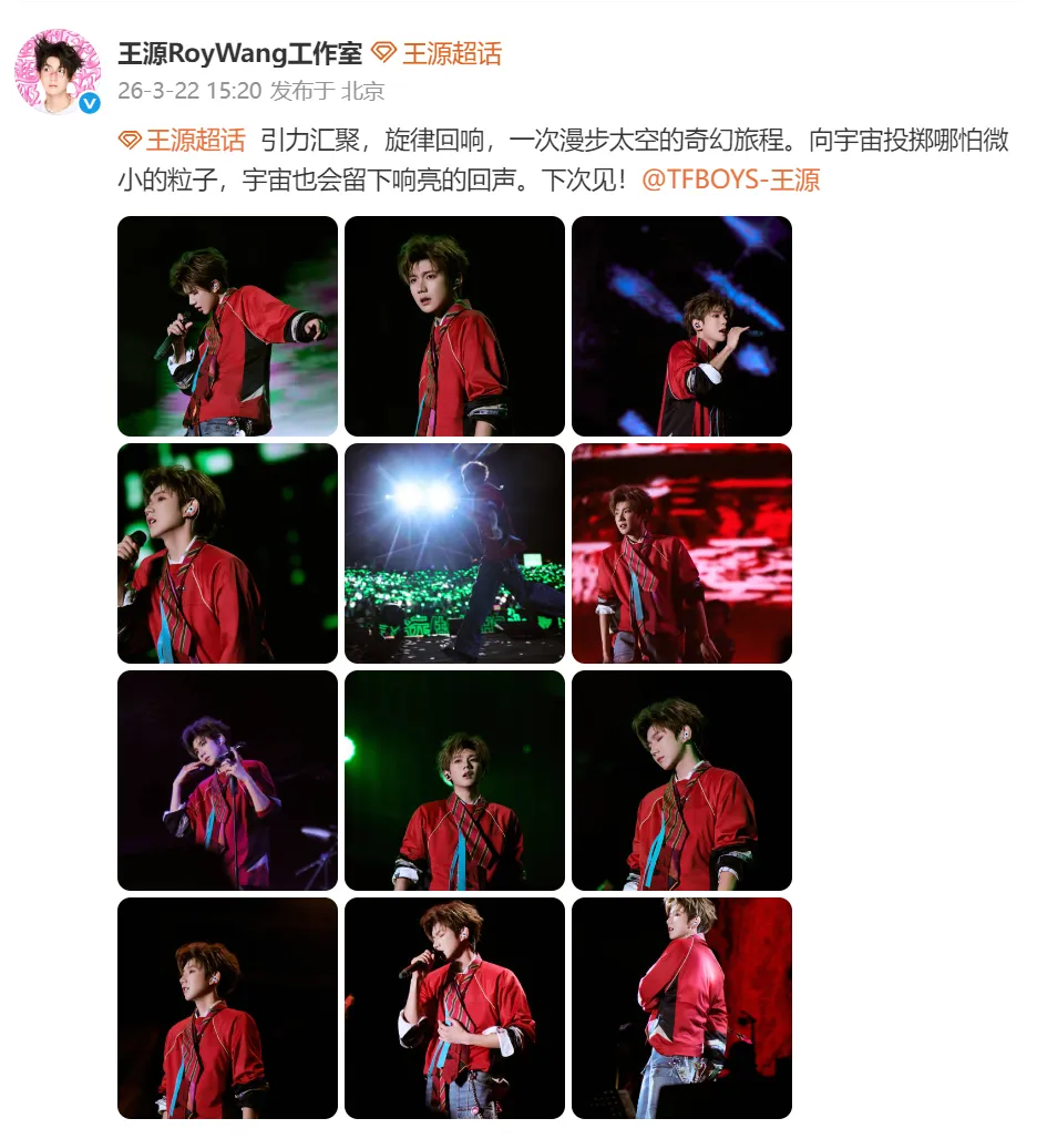 王源超话 引力汇聚,旋律回响,一次漫步太空的奇幻旅程。向宇宙投掷哪怕微小的粒子,宇宙也会留下响亮的回声。下次见!@TFBOYS-王源