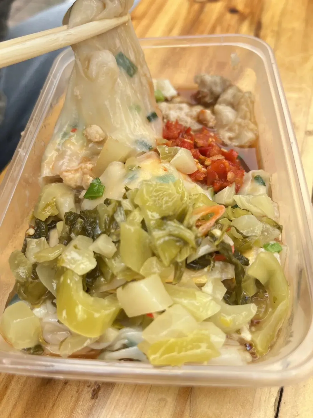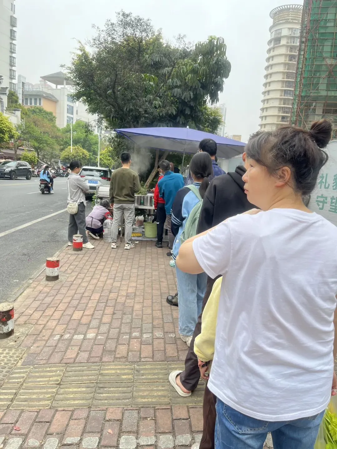 原本计划去打卡河池六圩老奶米粉,脚步却意外被凤翔路小学附近的一家肠粉摊留住。不大的简易摊位前,三个折叠小桌早已坐满食客,长长的队伍排了十几号人,安静却有序地向前挪动。有人踮脚张望,有人低头刷着手机,没有喧闹的嘈杂,只有满心的期待,在清晨的微风里悄悄蔓延。