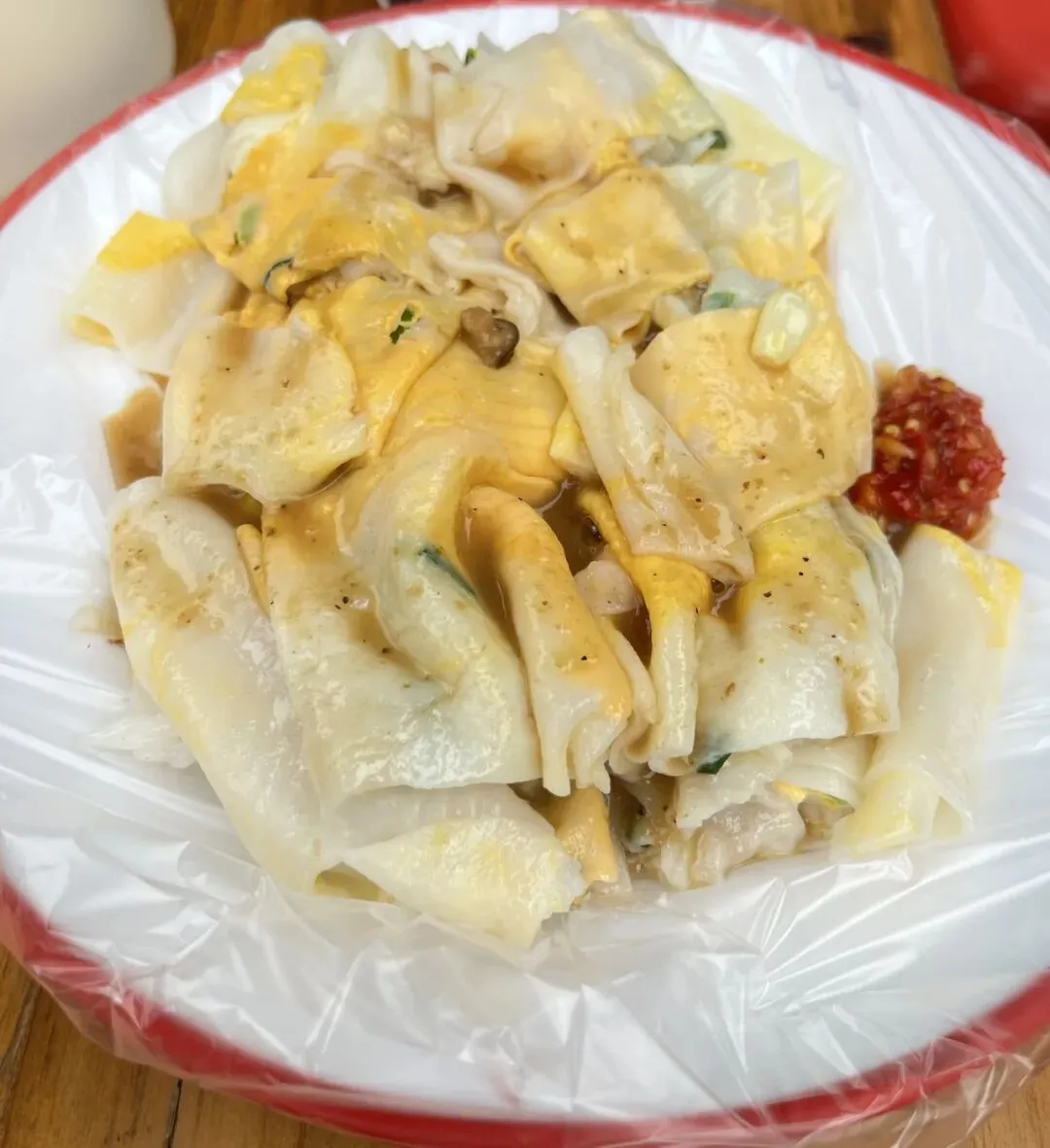 肠粉略烫,筷子挑起吹吹,入口嫩滑,汁水丰盈,滚烫滑爽迅速占据口腔,一边吸气一边略嚼咽下,鲜香味还在口腔,这路边的肠粉一点不比大店的差呢,难怪这么多人排队,等上二十分钟也要品尝的了。