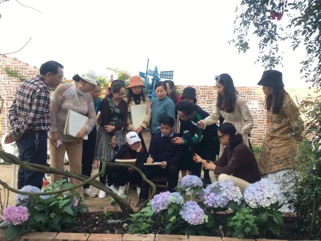 通过引导学员观察自然和照片中的紫藤,提取紫藤的结构特征,包括花瓣、花头、叶子、枝杆的形态、光影变化及色彩表现。循序渐进地示范演示花瓣、花头、叶子、枝杆的表现技法,并逐步培养学员掌握每一部分的创作方法与技巧。讲解如何通过简单的几何构图表达复杂的自然形态,特别是如何从简单到复杂逐步进行细致刻画。