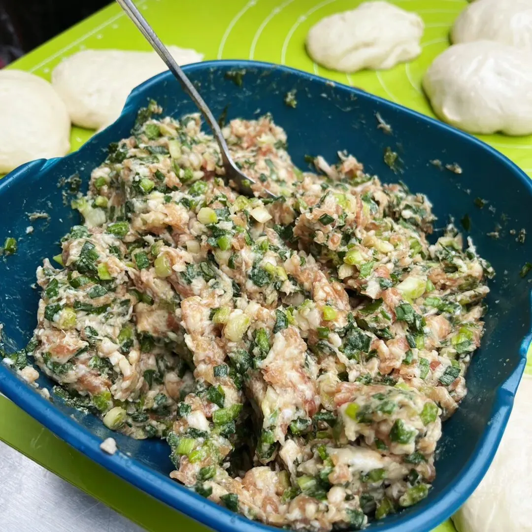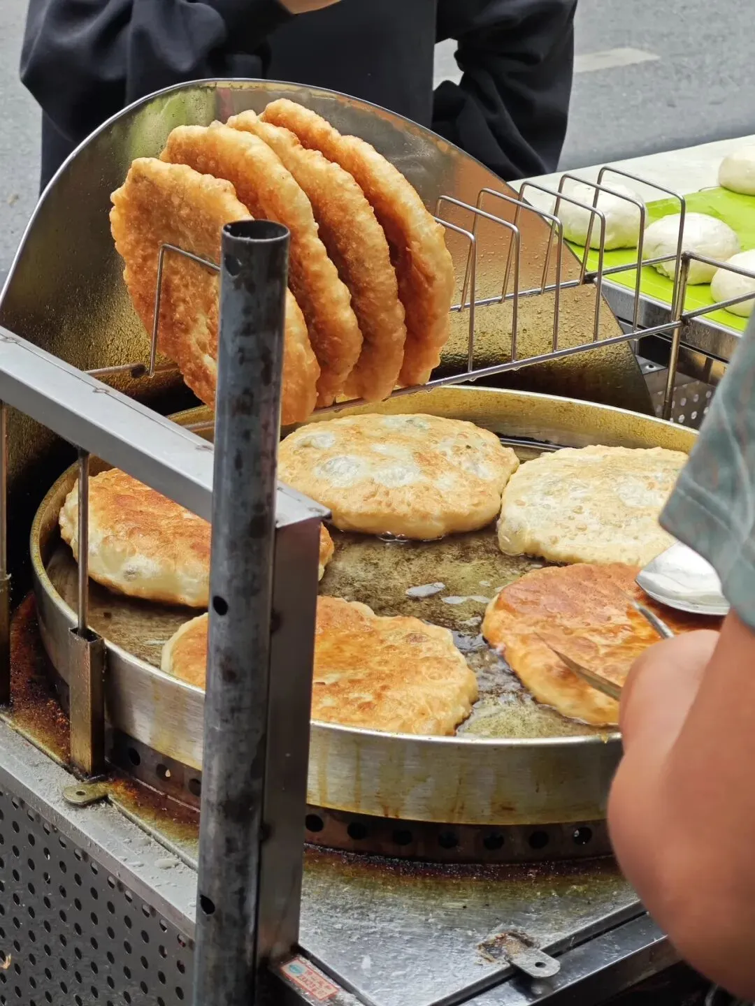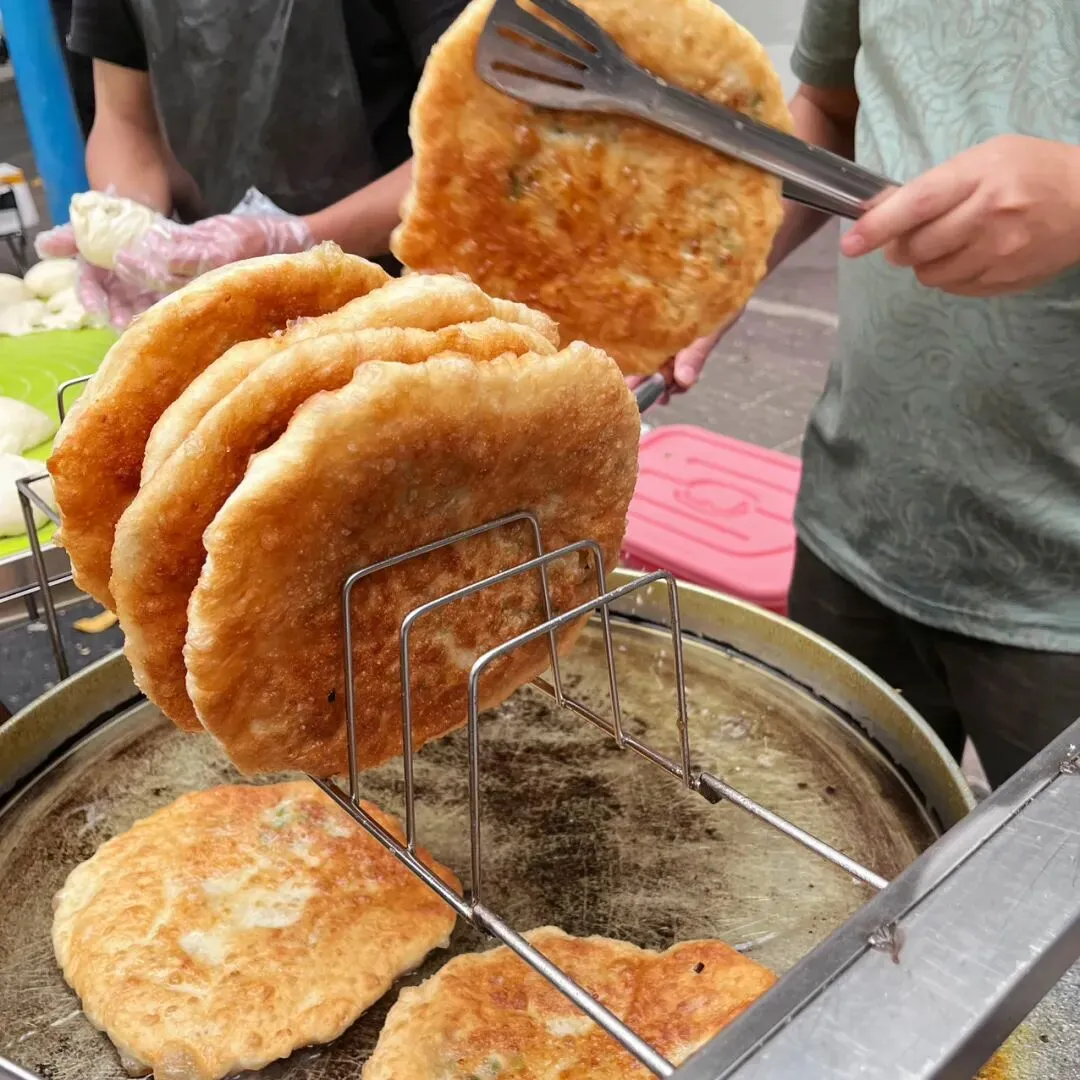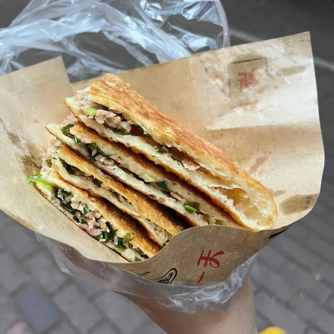 周末逛新竹路的时候,被这路边的“葱肉饼”给吸引住了,这是加肉版的葱油饼。刚出锅的葱肉饼,金黄金黄的,还在锅里煎着的葱肉饼,滋滋地鼓着肚子,圆润饱满,看着里边的馅料不少。虽然刚吃饱饭,但是还是忍不住立马就买了一个,老板熟练地把它切成4块,用纸袋包着。这种半开的纸袋,让人忍不住,直接在路边就吃了起来。这葱肉饼里面的馅料就是简单的猪肉拌葱花,用擀好的面皮包起来,这面皮就是普通的面粉皮。一个个包起来,然后自然风化面皮表面,看着还以为是包子。南方“土包子”的我,对于面食不太熟悉,也不知道这样先风化面皮表面,是不是可以更好地把饼给煎黄煎脆。刚出锅的葱肉饼,饼皮还泛着油润的光泽,经过煎烙,葱油饼表面焦黄酥脆。这让人想起武大郎烧饼,也让人想起了新疆馕饼,但是这葱肉饼,吃起来却和它们不太相同。这葱油饼吃起来不干硬,柔软有劲道,我还以为它吃起来会是干巴巴的,但是没有。它外面焦脆,里面却是柔韧有润泽感。这口感很家常,好吃不腻,外面的很多东西太重口味,难得有这种恰到好处的味道,太喜欢了。想起家乡的小吃“集劳”也是简单的面粉、韭菜、碎肉,但是这葱油饼只是葱花和韭菜不一样,吃起来口味却完全不一样。这么一个大饼5块钱一个,没吃得完,拿回家的时候冷了,放微波炉叮一下,感觉更好吃了,拿来配白粥,发现也很好吃,虽然都是碳水,但是它俩的口味却很搭。