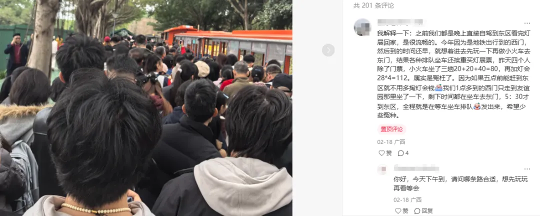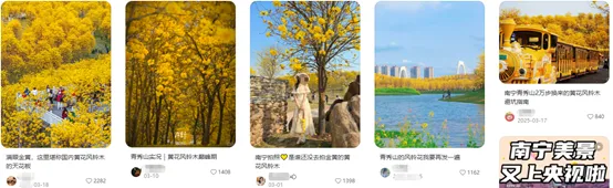 这是一个讨论“才气是否横溢”的问题。目前青秀山出圈的主要特点和亮点是极其方便游客拍照、打卡。朋友圈、小红书发起来特别让人羡慕。具体包括各类花、树、草的专类公园,新春灯展,北门梦幻夜游。另外还有好像全国都一样,只是外貌略有不同的文创伴手礼。但说到底,这些“宠爱”靠的都是新鲜感,难以一而再、再而三地吸引游客持续消费、买单。近期网友打卡美照(图片来自网络)