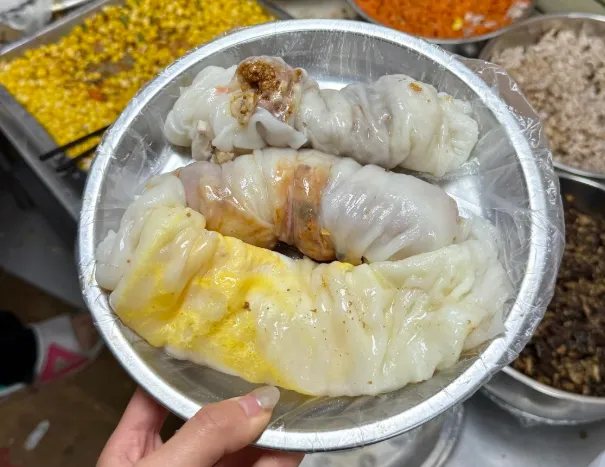 卷筒粉做法不复杂。米浆摊成薄皮,蒸到刚好起泡,卷进肉末、豆角或酸菜,再切段装盘,最后淋上酱油、蒜水和一点辣椒油。关键不是料多,而是皮要柔,酱要清,吃起来才顺。