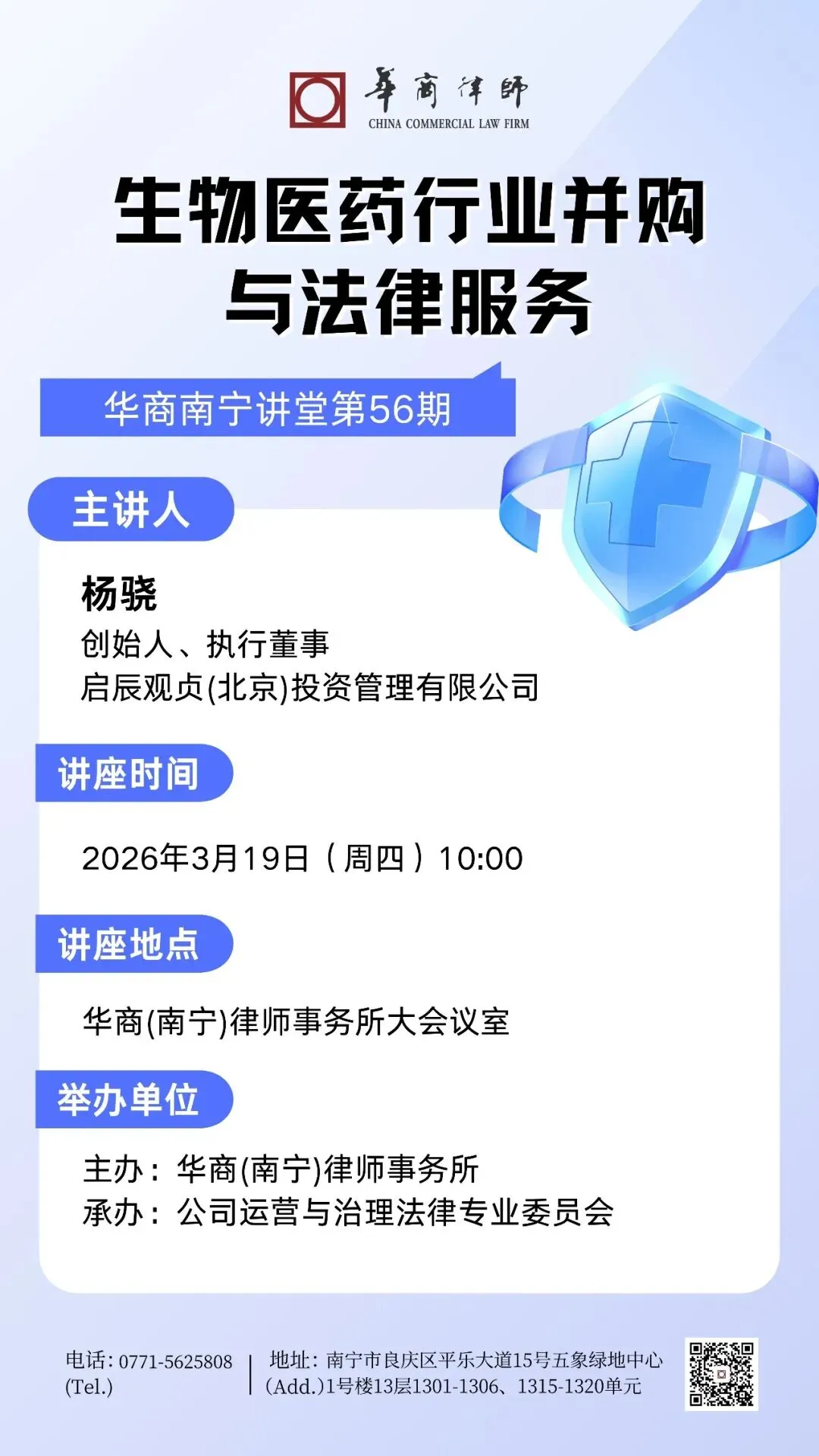 2026年3月19日,华商南宁课堂第56期在华商(南宁)律师事务所大会议室举行。本期讲座作为开年后第一课,特邀启辰观贞(北京)投资管理有限公司创始人、执行董事杨骁先生莅临华商(南宁)律师事务所讲授《生物医药行业并购与法律服务》。广西青蓝投资有限公司消费部合伙人闻悦玲女士到访交流,所内外多名律师同仁共同参加本次讲座。讲座由公司运营与治理法律专业委员会委员韦龙祥律师主持。