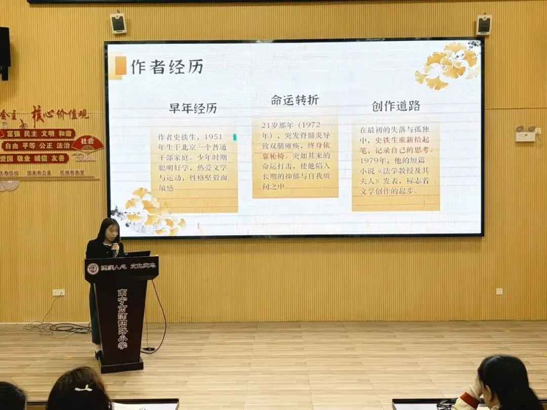 覃敏华老师分享史铁生的《我与地坛》,讲述作者在命运低谷中于地坛完成自我救赎的历程。她从文本中提炼出生命思考:苦难可摧毁肉体,却无法摧毁灵魂,教育者应引导学生接纳不完美,在平凡中寻找精神寄托,珍惜陪伴与成长。