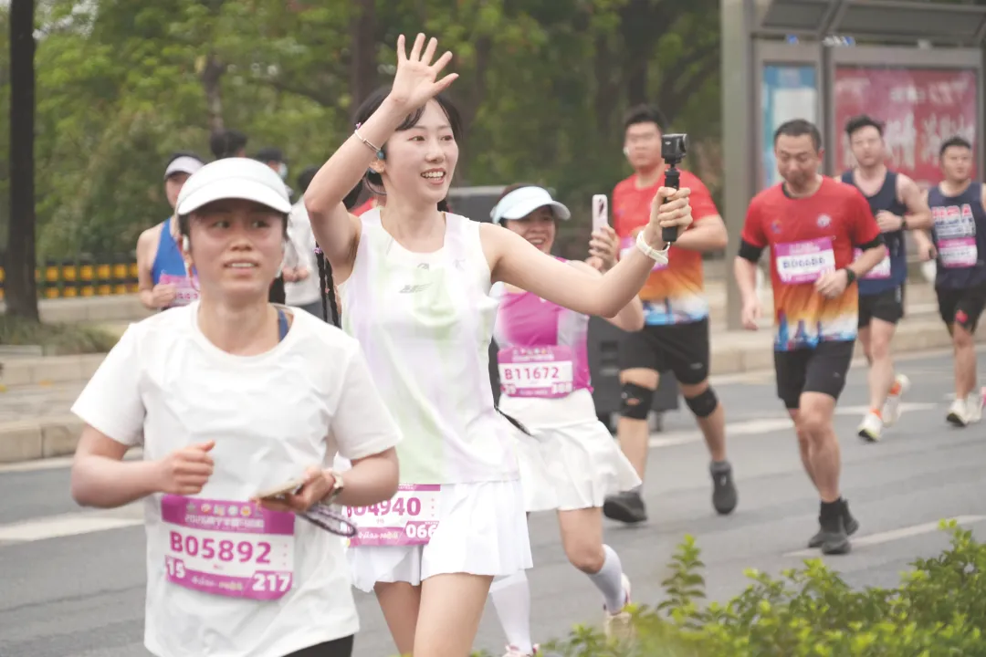 市民群众驻足在赛道沿途各个路口观赛,为选手呐喊助威。起终点处,马山会鼓的鼓声铿锵有力,激励着参赛选手奋勇前行。火热的竞赛场景,绘就一幅活力四射的“运动绿城”画卷。