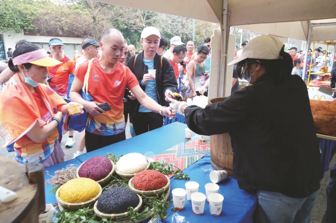 组委会在南宁博物馆西门艺华街设置了一系列文旅商活动,通过商家展销、文旅打卡、美食免费供应和放松按摩等服务,打造赛事“第二个赛场”,为选手送上一场文体旅商融合盛宴,引来参赛选手争相参与。特别是美食补给区,烤猪、五色糯米饭、木薯羹等免费供应,让参赛选手流连忘返。“太好吃了,想不到南宁的比赛有这么丰富的补给。不仅赛道有水果,赛后还有烤猪免费吃,太贴心了。”来自广东的参赛选手田国礼说。