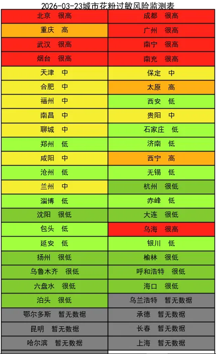 北京、成都、广州、武汉、南宁、烟台、南充、乌海花粉过敏风险很高! 重庆、太原、西宁花粉过敏风险高!3月23日花粉过敏指数播报