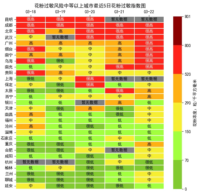 昆明, 成都, 北京, 武汉, 广州, 烟台, 南宁, 乌海, 南充, 贵阳, 上海, 保定, 太原, 西宁, 银川, 天津, 南昌, 福州, 沧州, 淄博, 石家庄, 重庆, 合肥, 咸阳, 杭州, 榆林, 兰州, 聊城, 延安, 共有 29 个城市最近5日曾经花粉浓度过敏风险中等以上,请持续注意防护!