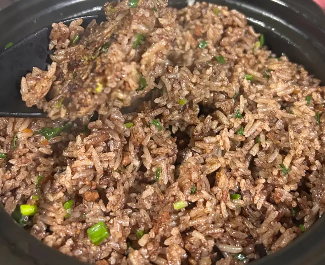 羊血炒饭:用马山本地黑山羊的新鲜羊血、羊肉(或羊碎肉),搭配干爽的隔夜香米饭。