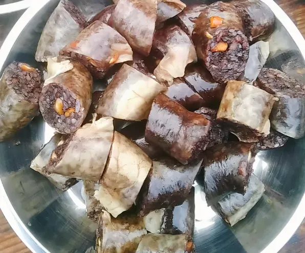 猪龙棒(血肠):壮语俗称 “龙棒”(Long Bang),汉字写作 “猪龙棒” 或 “猪龙碰”。因煮熟后形态盘曲如龙,且口感弹牙、咬下有蹦脆感,故名。切段直接吃,软糯鲜香。切片油煎至外脆里嫩,更香更入味。