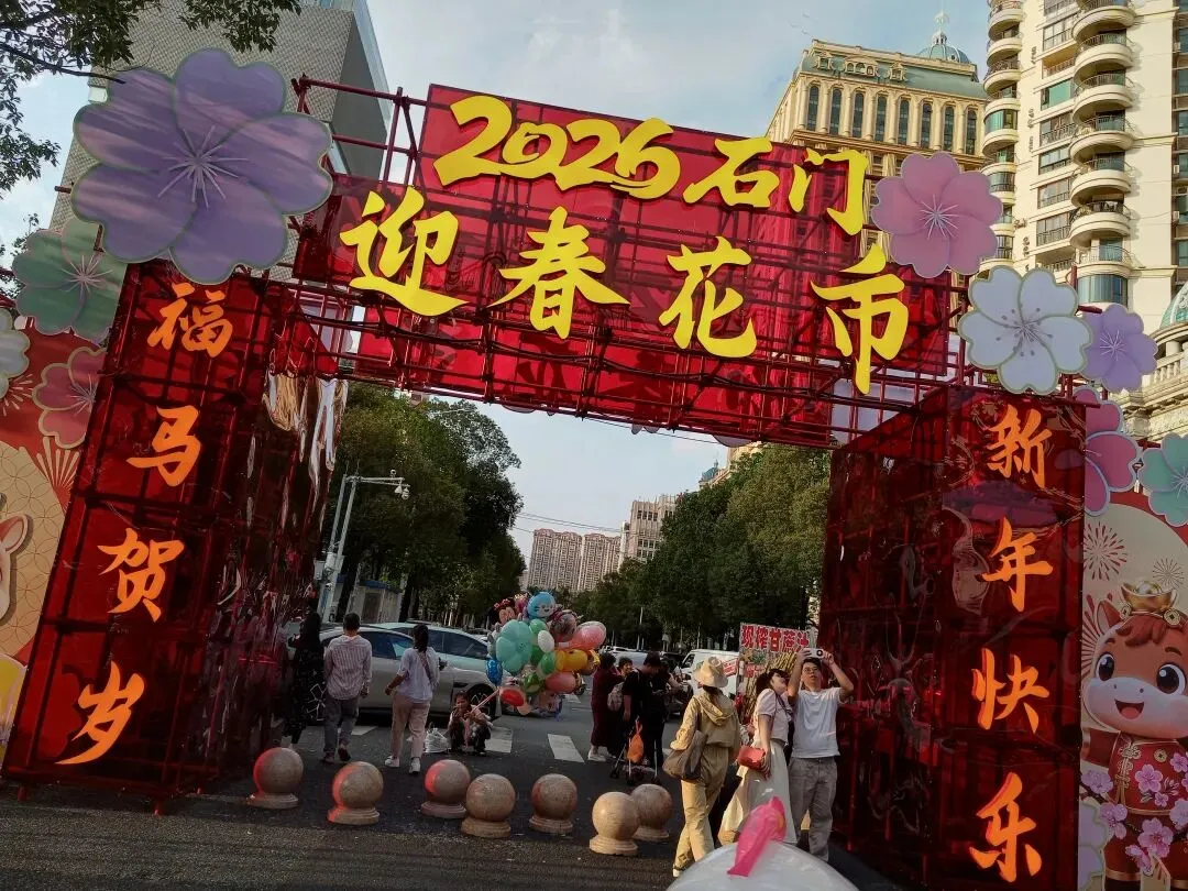 进门口就是一个大的拱形门,迎春花市两排摆放着烧烤,零食,特色小吃,以便游客填饱充饥。