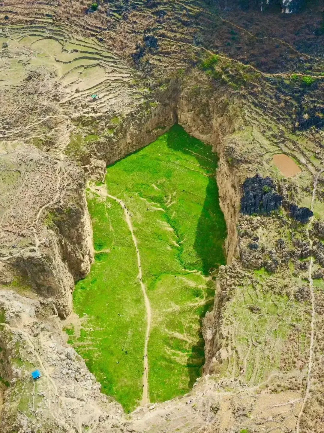 丁达尔光效:正午阳光穿透天坑裂隙,投射出“上帝之眼”般的光束,照亮洞内晶莹水珠,宛如神迹。