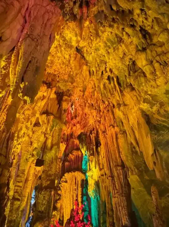 石钟乳与石笋:洞顶垂挂的钟乳石由碳酸钙沉积而成,部分已生长数万年,形态如冰瀑、葡萄、珊瑚,极具观赏价值。