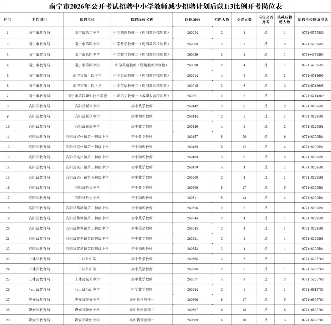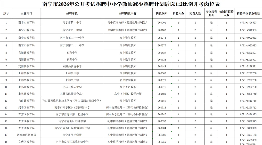 2.南宁市2026年公开考试招聘中小学教师减少招聘计划后以1:3比例开考岗位表