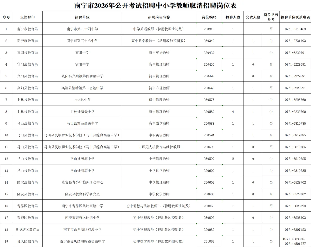 1.南宁市2026年公开考试招聘中小学教师取消招聘岗位表