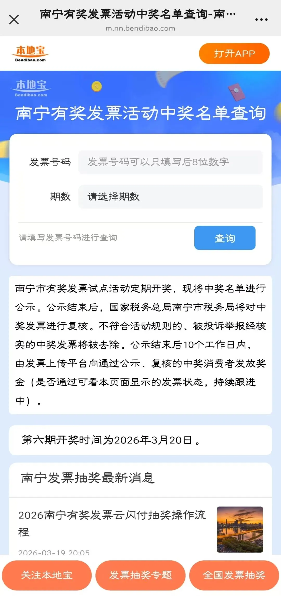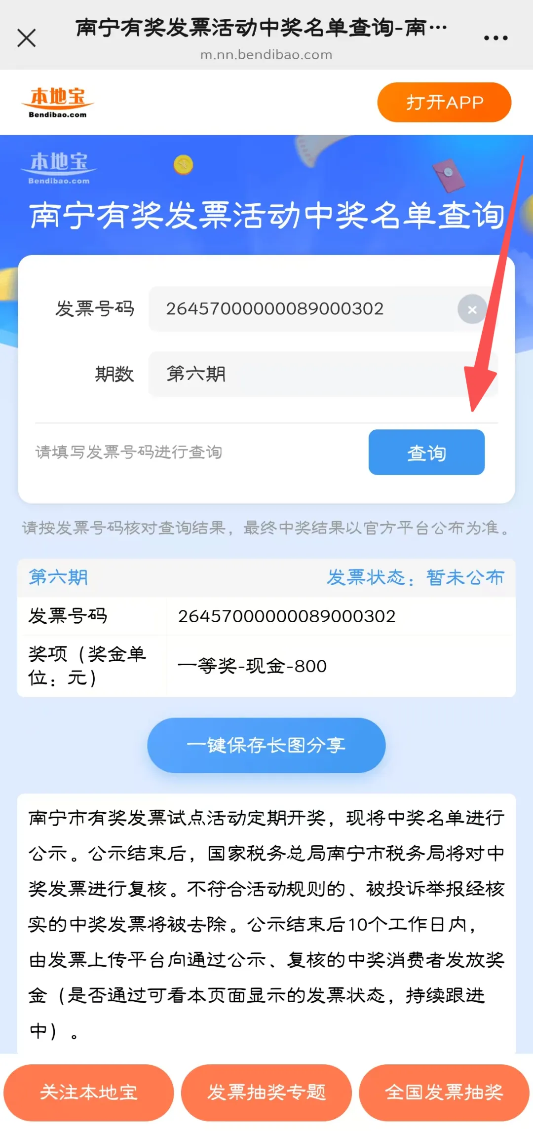 扫描/长按识别下方二维码,关注【南宁本地宝】微信公众号,在首页对话页面发送【发票】,获南宁有奖发票中奖名单快捷查询入口(输入发票号码即可)、各期中奖名单下载入口(电子表格通过发票号码检索可以更快查看信息哦)、奖金发放名单快捷查询入口等。