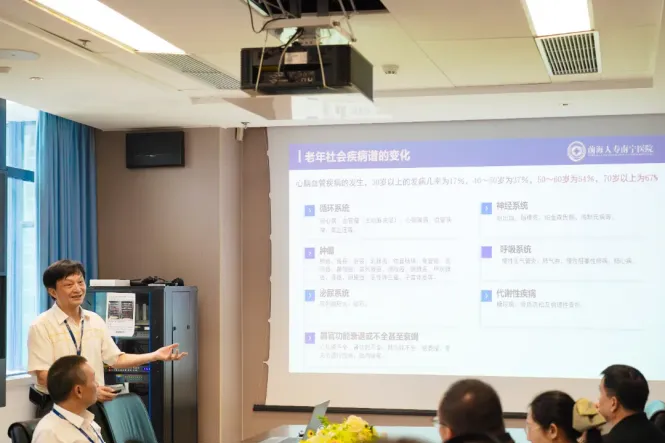 林辉院长介绍了前海人寿南宁医院的基本情况、发展目标、近远期战略规划及特色优势,包括以心脑血管疾病诊疗为重点的大专科强综合特色、专业技术精湛的医疗精英团队、先进的硬件环境、体现人文关怀的服务模式等,以及目前我院在健康医疗领域做出的尝试与创新,并耐心讲解了前海人寿南宁医院、前海人寿南宁护理院及前海人寿幸福之家南宁康养社区三院合一,“医疗-康复-养老-善终”四维一体、“医疗床、护理床、养老床、家庭病床、安宁病床”五床联动的深度医养融合新模式。
