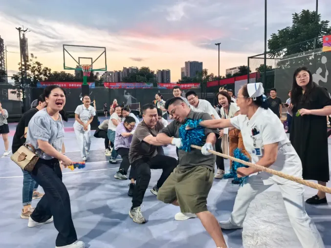 拔河比赛点燃全场,平日里握手术刀、持听诊器的手此刻青筋暴起,紧握麻绳凝聚力量;日常查房时稳健轻快的脚步,此刻如钉入地面般死死蹬地,身躯后仰形成坚韧的防线。赛场上,平日里冷静专注的医护人员激情澎湃、全力拼搏;场下的啦啦队也“火力全开”,疯狂打call;员工们口号震天,体现“凝心聚气”主题。