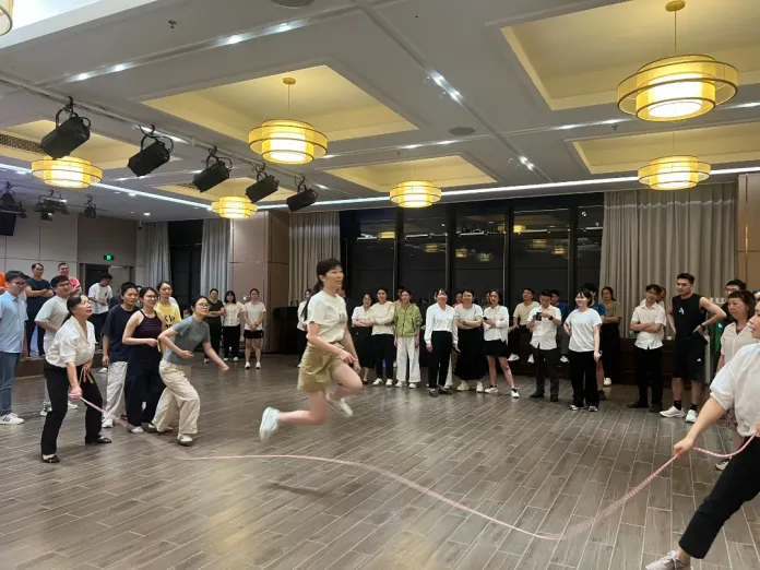 跳绳项目中,大家默契配合甩动长绳,场边的加油声此起彼伏,现场节奏欢快,员工们默契配合,跳跃声与欢呼声交织,彰显了“团结奋进”的精神。