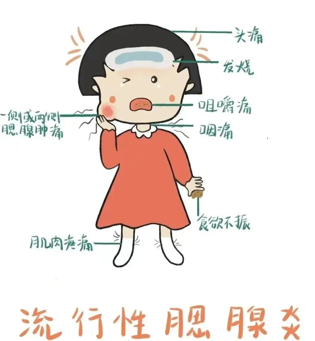 发热、头痛、咽痛、恶心、呕吐等,数小时或1~2天开始出现腮腺肿大,多为一侧肿胀后1~4天累及对侧,肿胀多在3~5天达到高峰,7~10天逐渐消退。