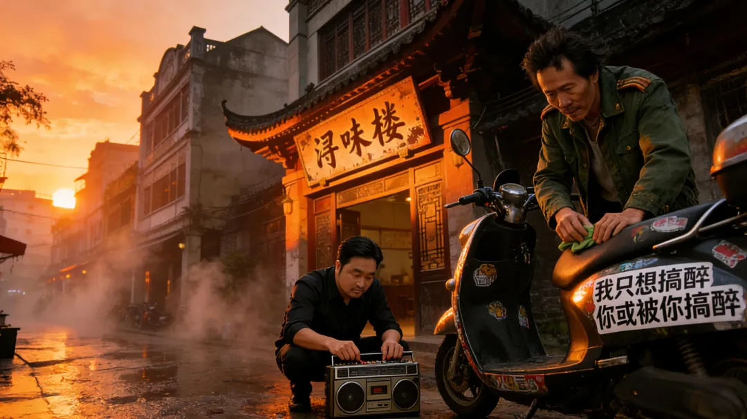 阿牛哥正蹲在门口,专心致志地摆弄着他那台老旧的收音机,里面传出咿咿呀呀的粤剧声。三妹在厨房里忙碌着,阵阵酸笋的独特气味伴随着锅铲的翻炒声飘了出来,那是她正在准备今晚的酸笋炒田螺。火云邪神则在一旁全神贯注地擦拭着他那辆宝贝电驴,电驴上贴了“我只想搞醉你或被你搞醉”的贴纸,在余晖下闪着奇异的光。