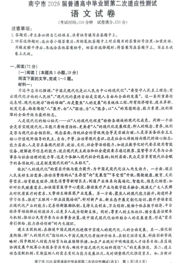 南宁市2026届普通高中毕业班第二次适应性测试语文试题