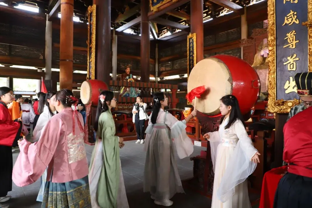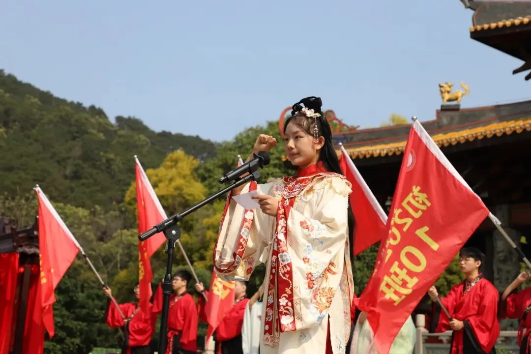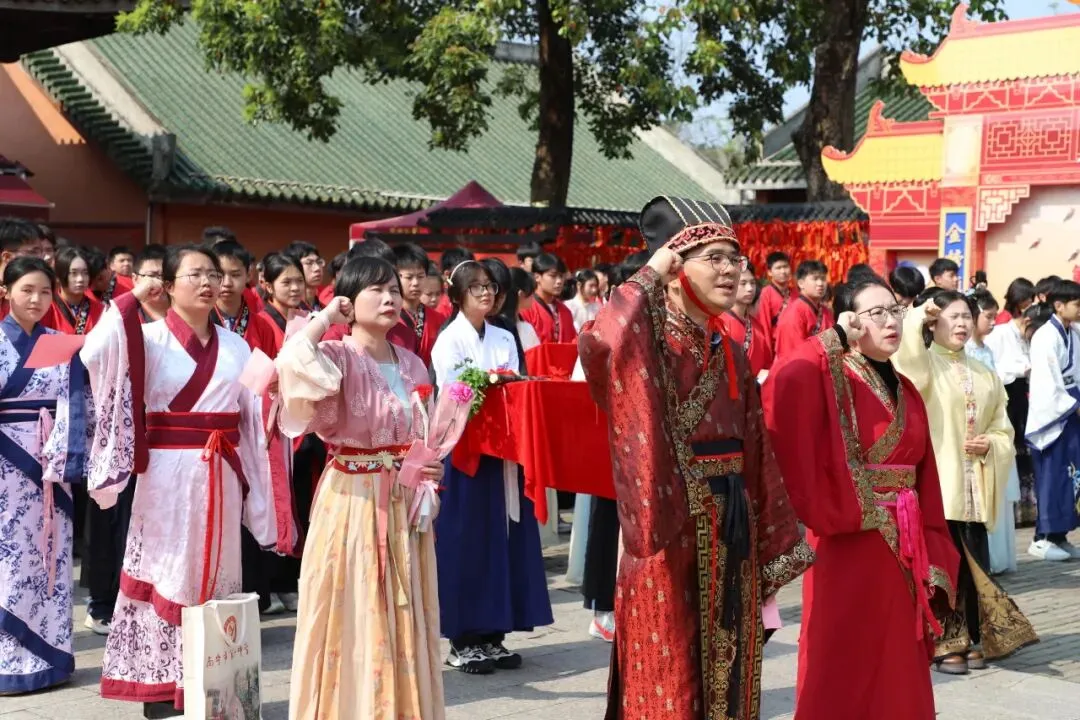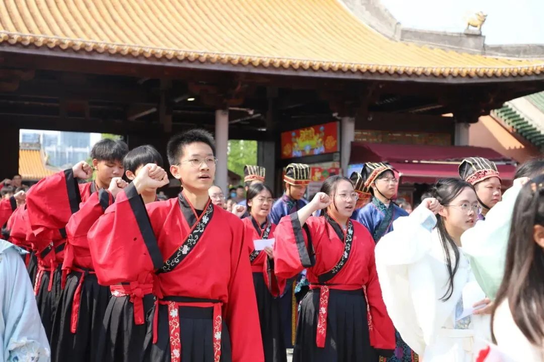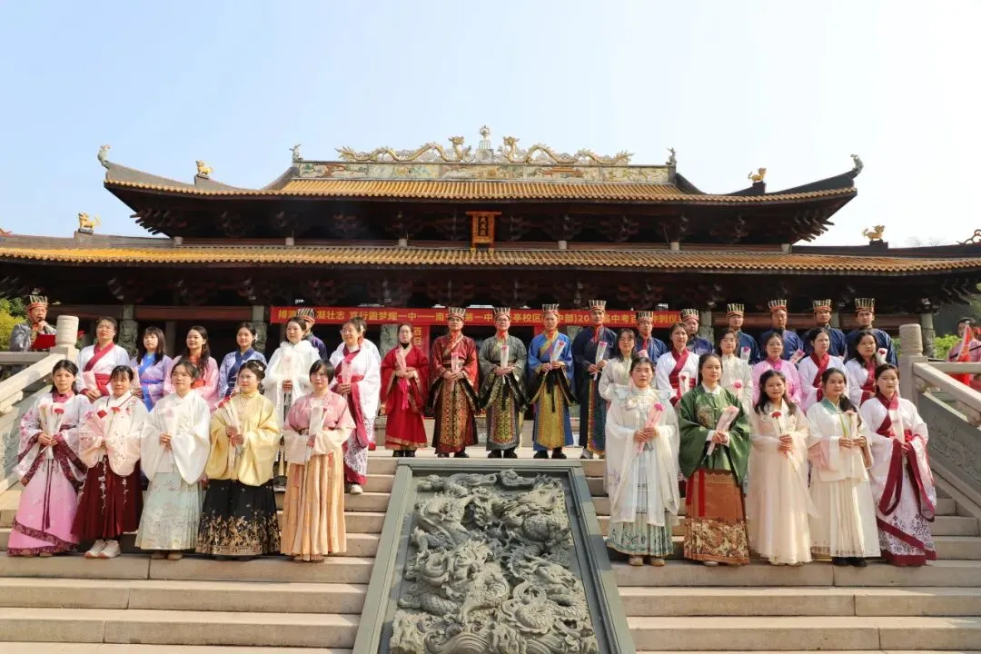 上午9时,晨曦初照,棂星门前,师生们着汉服肃立。随着司仪一声“告天”,仪式正式拉开帷幕。 在司仪与礼生的引导下,师生队伍依次穿过棂星门、状元桥、泮池、大成门,步入大成殿广场。一步一礼,一礼一诚,仿佛穿越千年,与圣贤对话,与梦想同行。