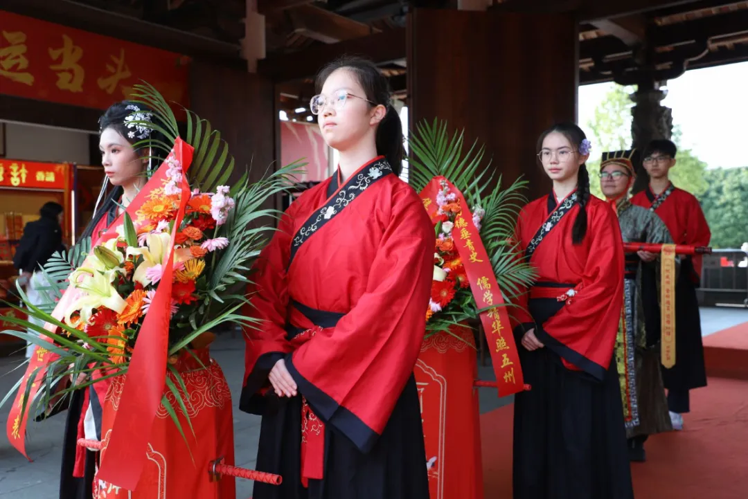 在大成殿前,学校领导与学生代表依次向孔子敬献香、花、果、文昌塔,以简礼致敬先贤,祈愿学子们厚积薄发、金榜题名。