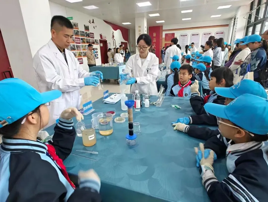 此外,活动还通过水质微生物检测等实验,将复杂的制水工艺和自来水消毒原理变得触手可及。参加活动的小朋友们围在实验台前,亲手操作简易实验设施,看着水样在自己手中逐渐变得清澈,脸上写满惊喜与成就感。