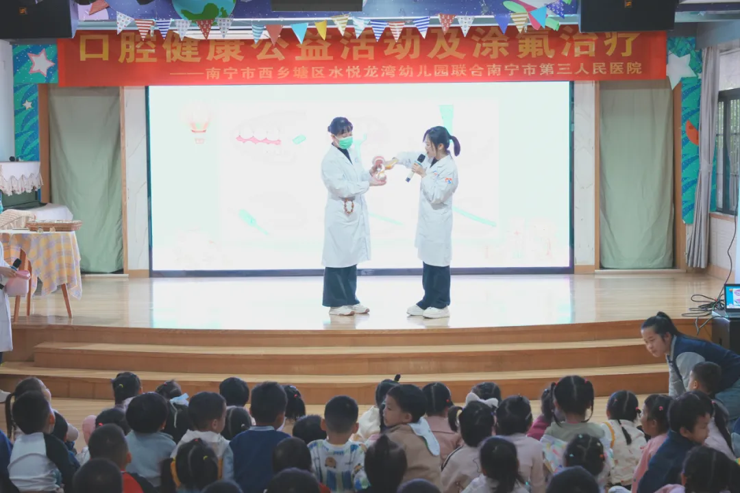 3月17日,南宁市第三人民医院口腔科医护团队走进桃李水悦龙湾幼儿园,开展儿童口腔健康专场宣教与公益涂氟活动。活动现场,口腔科医生以生动易懂的方式为孩子们讲解口腔健康知识,通过图文展示帮助小朋友们认识牙齿结构、了解龋齿成因与危害,重点传授科学防龋方法。
