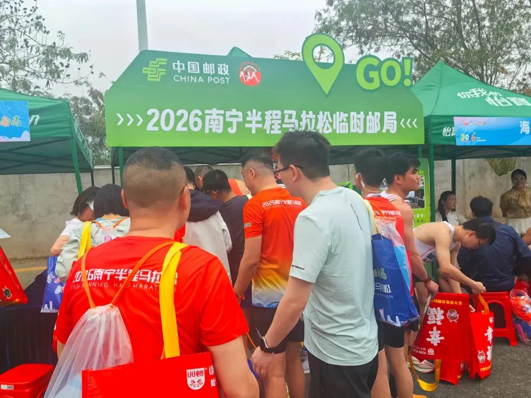 临时邮局以“邮政绿”为主色调,配备明信片即时打印设备,提供个性化明信片定制服务,同时展销南宁风光文创、周同学联名盲盒、马年生肖文创等特色邮政文创产品,让跑者在赛事之余,既能定格美好瞬间,也能带走一份专属的南宁记忆。
