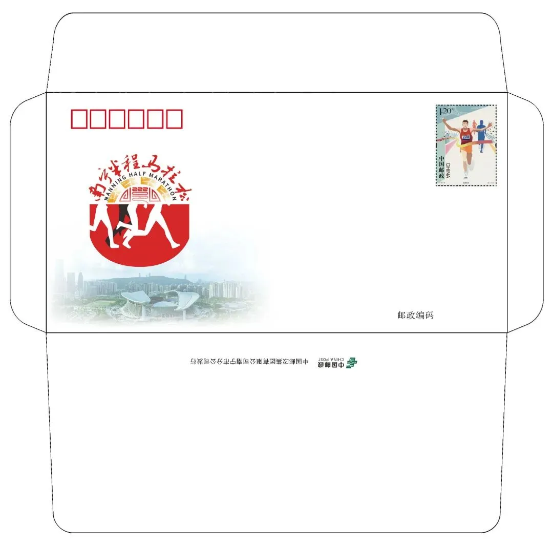 此外,南宁邮政特别推出赛事纪念章和邮资封。纪念章以奔跑者半身剪影为核心,镌刻赛事中英文名称,融入铜鼓、壮锦等广西民族元素,醒目“邕”字标注举办地;纪念封采用赛事标志为主视觉,背景衬以南宁风光与广西体育中心景观,搭配马拉松邮票,既传递马拉松精神、展现城市风貌,又兼具收藏价值。